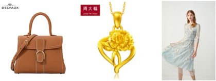 DELVAUX经典手提包(左)、周大福足金吊坠(中)、朗姿重工蕾丝刺绣连衣裙(右)