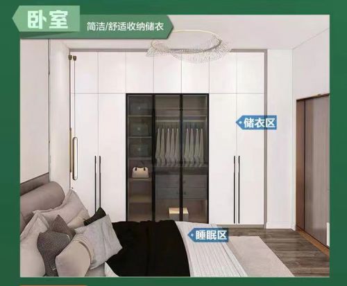 卧室是居住者休憩的港湾,百安居将卧室划分成睡眠区和储衣区。储衣区采用分格设计,包括挂衣区和叠放区,根据衣物款式实现分层存放,实现空间利用效率最高化;睡眠区则以“静”、“净”为主,通过深色系营造氛围感,高级而不单调,达到美观和舒适性的统一。
