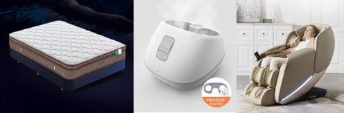 雅兰天然乳胶床垫(左)、网易智造蒸汽足浴盆(中)、芝华仕智能语音健康按摩椅(右)