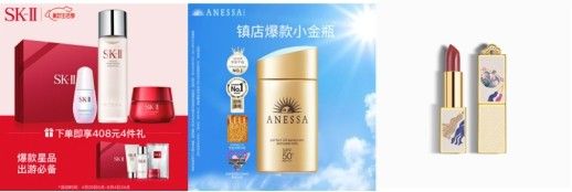 SK-II护肤套装礼盒(左)、安热沙户外清透防晒乳(中)、故宫文化荷包口红(右)