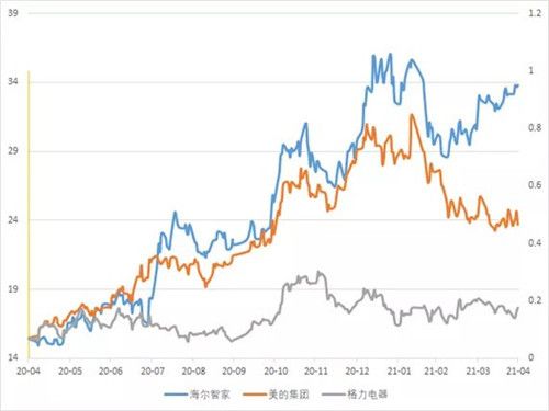 在过去一年的市场行情中,三巨头的具体走势出现了明显分化,处于领涨位置的,是率先走出疫情阴霾的海尔智家。