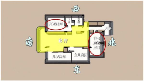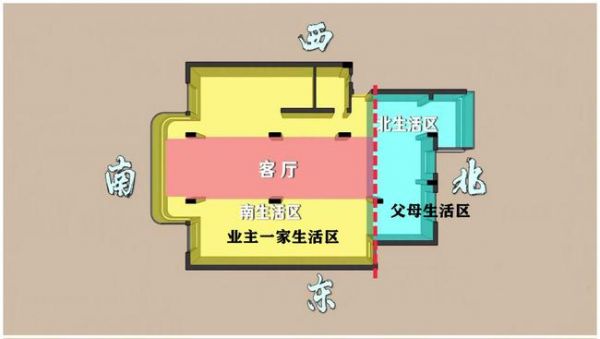 南边生活区主要是客厅,业主一家人的卧室以及卫生间,而北边生活区则是爷爷奶奶房间以及厨房,年纪大的人睡得早起得早,早上起来做饭不用担心会影响到业主一家休息。