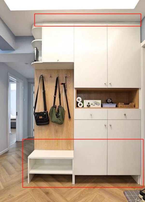一楼没有定做玄关柜,所以空间利用不够充分,所以二楼请木工量身定做通顶玄关柜,没有卫生死角,收纳空间也加倍!细部设计,在底部留有30公分的空隙,用来放置家居鞋子,使用非常方便;同时把换鞋凳和鞋柜融合在一起,既可以节省空间,又可以提升鞋子的使用体验。