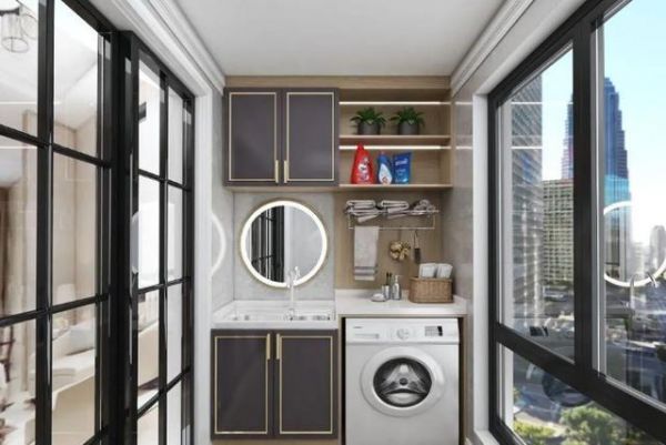 为了确保室内采光,所以将阳台和客厅用门框分隔开,让整个室内的采光达到最佳。露台空间也得到充分利用,洗衣机+洗手池+收纳柜的整体设计,使露台更显实用。