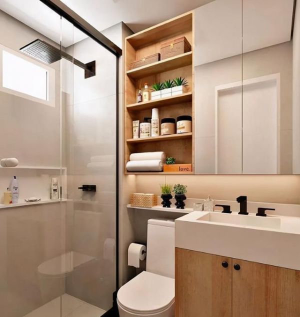 厕所空间小,但收纳的物品却很多,为了避免杂乱,他利用厕所上方的置物架,放置常用物品,同时在浴室里设置壁龛,放置洗漱用品,大大提高空间的利用率。