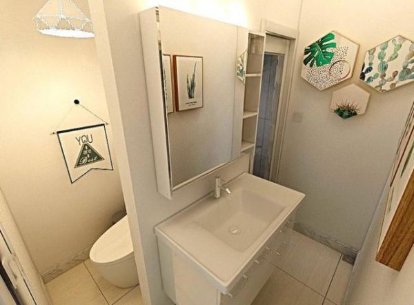 悬挂式洗漱台+镜柜的一种设计细节调整。由于洗漱台悬挂在空中,不仅使卫生间外观更宽敞,而且还减少了卫生死角,清洁更方便;同时镜柜大大加强了卫生间的收纳功能,让方寸间也能整洁。