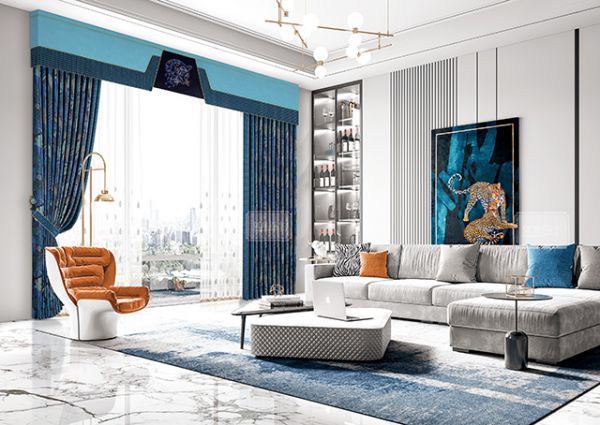 设计师通过灰白咖清浅的大地色系搭配,弱化了窗帘深色的浓郁感,让整个氛围更加自然协调。