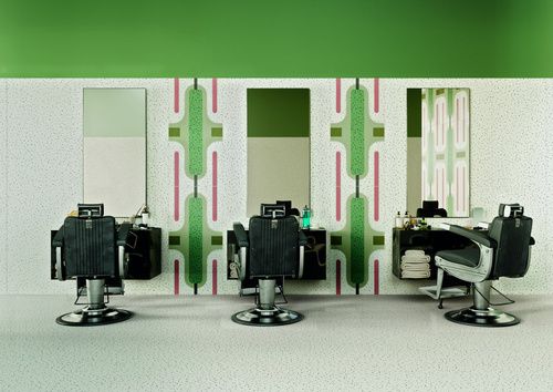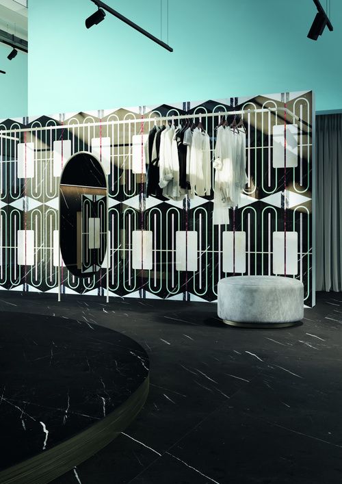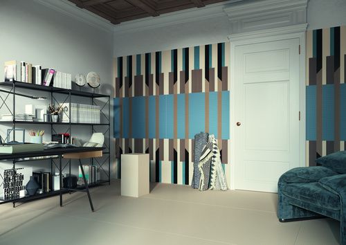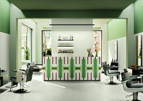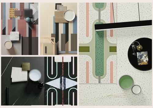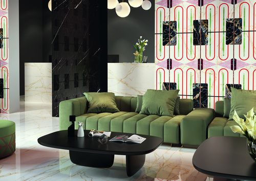 “Chimera”开发了四个图形主题:Empatia,Radici,Ritmo和Colore(共情、根源、节奏、色彩),主题混合了不同的质感和颜色。在“共情”中,小丑的面孔与装饰艺术的图形参考相混合;在“根源”中,皮革和皮革制品的纹理被充分使用;“节奏”我们看到织物的纹理与Gunta Stolzl和Anni Albers的绘画之间所形成的对话;最后,“色彩”在一个用点装饰的底座上,与重复而密集的轮廓相结合。该系列的产品由一系列的板块拼接完成。从而诞生了一个具有强烈象征意义的原创陶瓷墙砖提案。