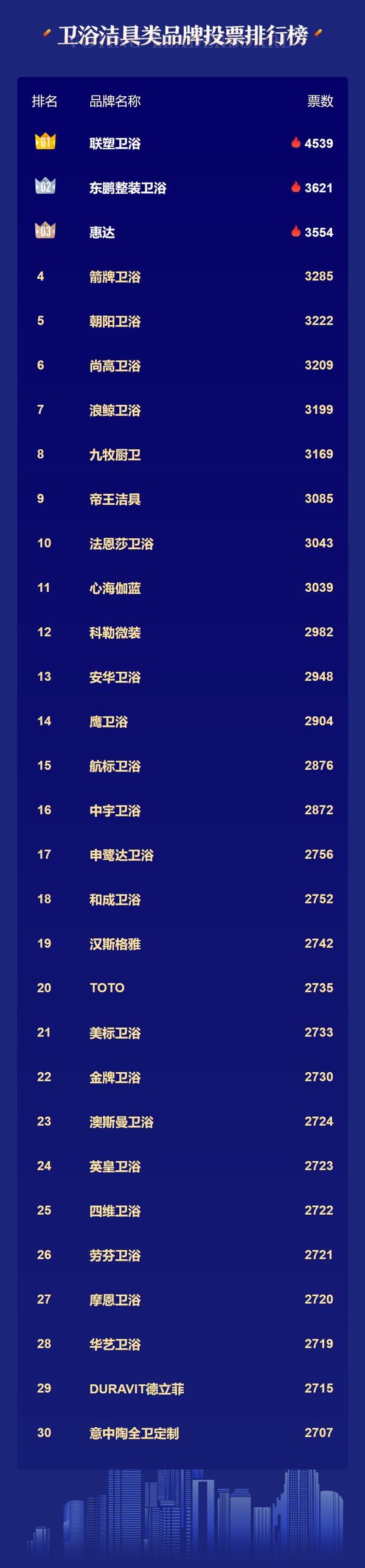 卫浴30强累计收获约15.1万票,其中TOP10榜单依次是:联塑卫浴、惠达、朝阳卫浴、尚高卫浴、帝王洁具、浪鲸卫浴、科勒微装、东鹏整装卫浴、箭牌卫浴。中宇卫浴。>>点击为卫浴品牌投票