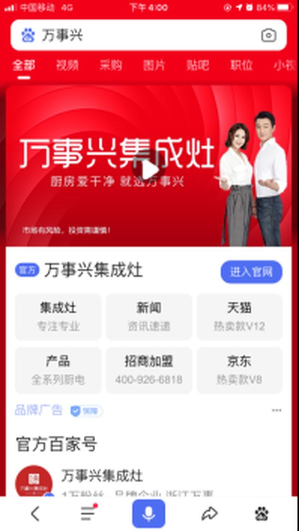 此外,百度搜索万事兴,还可直达官网,即时获取万事兴集成灶最新动态和产品资讯!在这强大的传播攻势下,将大幅度提升万事兴集成灶品牌在行业内的影响力,全面提高国内知名度,促进终端消费,让线下数千门店收益!