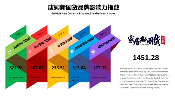 据了解,《2021年中国品牌日第二届家居新国货品牌指数研究》是以品牌增长力指数、科技创新力指数、企业社会责任指数、消费者满意度指数、品牌网络影响力指数等多个方向进行调研,汇集各方观点,此报告已经成为家居行业新国货品牌综合实力的鉴定标准,也在家居建材行业展示国货品牌的实力。唐姆在五个方面指数以高达1451.28的指数影响力成功锁定行业领军地位。