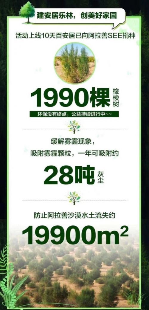 在此次年度环保公益活动中,百安居也发动消费者,一同携手支持SEE基金会“一亿棵梭梭”项目。自4月22日起至10月底,消费者前往百安居全国任意门店签环保家装,就能一起加入此次公益之行,为阿拉善关键生态区种下梭梭,成为环保卫士,为改善生态环境出一份力。