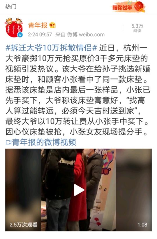 一张床垫,两家哄抢。一方是先手签单拒绝转让的备婚情侣,一方是硬要加钱买走床垫的拆迁户大爷。双方你来我往几个回合,最终年轻人以退为进,喊出“10万,拿出来,抬走”,没想到大爷当场答应,以金钱优势取得了床垫最终归属权。