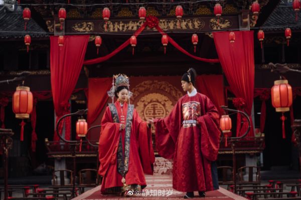 为了让婚礼的礼仪流程和布置细节更“传统”,静知花了半年时间查看资料,参考了《大明会典》中《士大夫婚礼篇》《太子大婚》等文献,在仪式上融入了绞面礼、却扇礼、沃盥礼、撒帐礼等传统仪式,并精心选用了一些宋制、明制的器具。