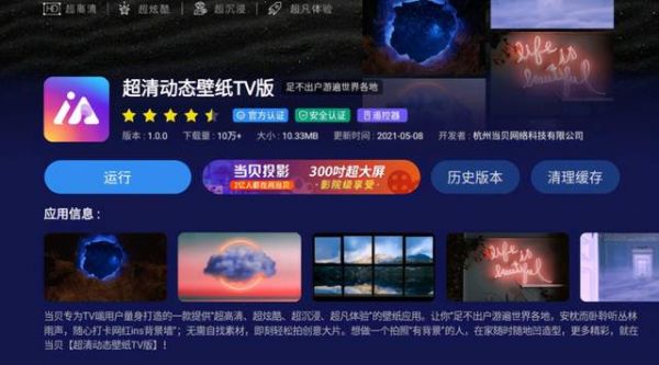 【超清动态壁纸TV版】当贝专为TV端用户量身打造的一款提供“超高清、超炫酷、超沉浸、超凡体验”的壁纸应用。让你“足不出户游遍世界各地,安枕而卧聆听丛林雨声,随心打卡网红ins背景墙”;无需自找素材,即刻轻松拍创意大片。想做一个拍照“有背景”的人,在家随时随地凹造型,更多精彩,就在当贝超清动态壁纸TV版!