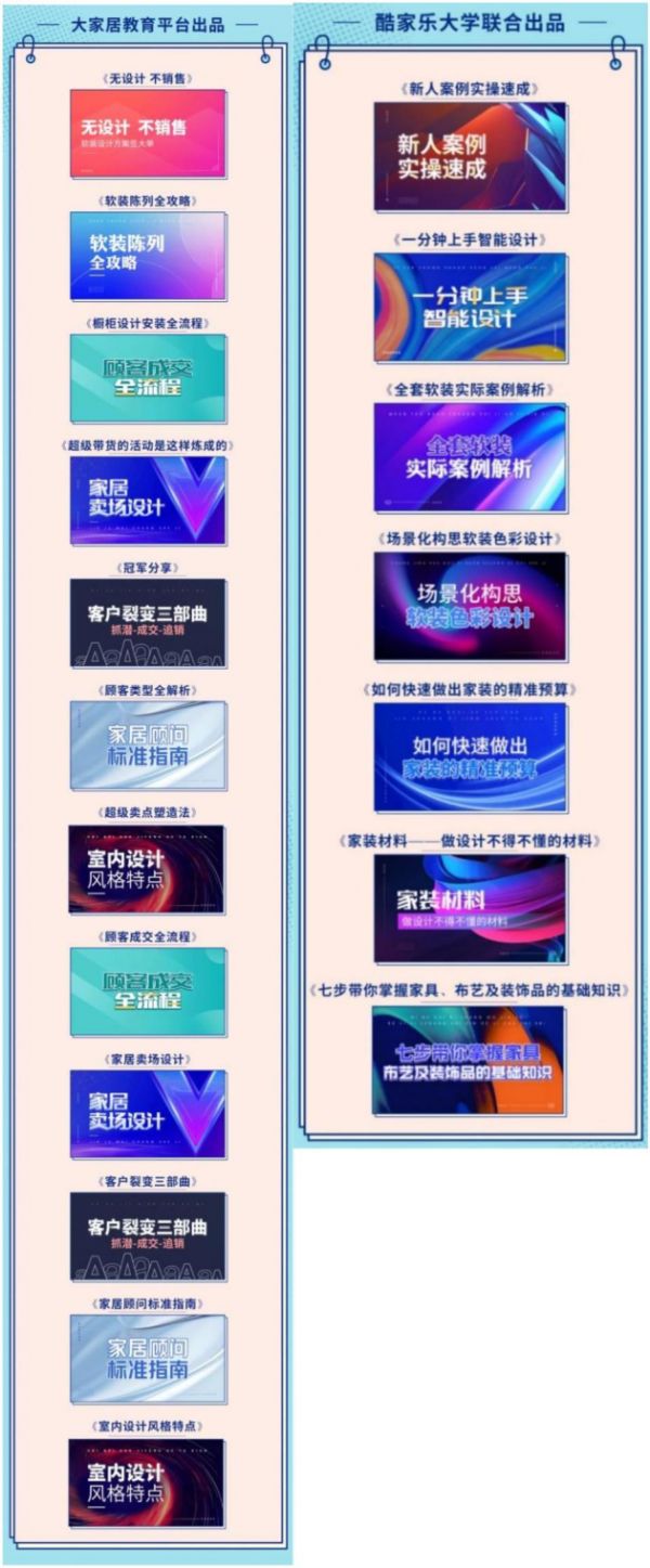 正因种种的大家居行业从业人员在职教育难题,中国大家居教育平台与酷家乐旗下的设计人才成长平台——酷家乐大学进深度合作,开展多方位的资源交互。作为国家教育资源库建设成员之一的家居行业智业企业,作为行业中规模大、体系全的人才培养基地,中国大家居教育平台集结了国富纵横 16 年行业师资、经验及课程资源,为与酷家乐的深度合作提供了强有力的资源保障。