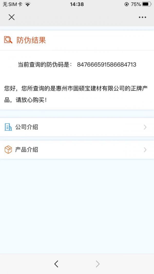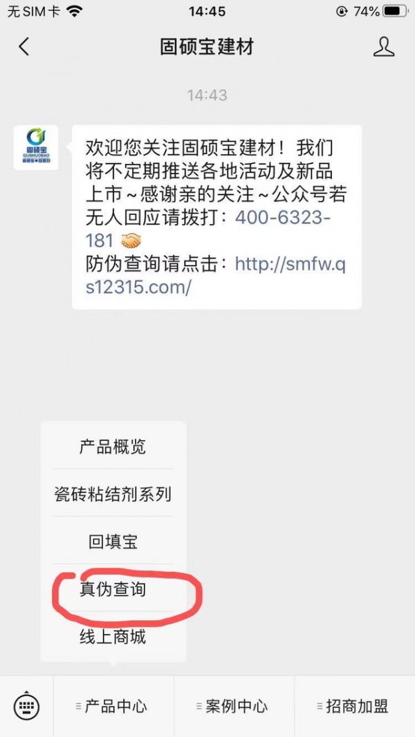 2、微信扫码,进入固硕宝建材公众号,弹出信息后点击文字所示的网址,或在左下角菜单栏点击“真伪查询‘’,进入扫码。即可查看真伪详情页面。