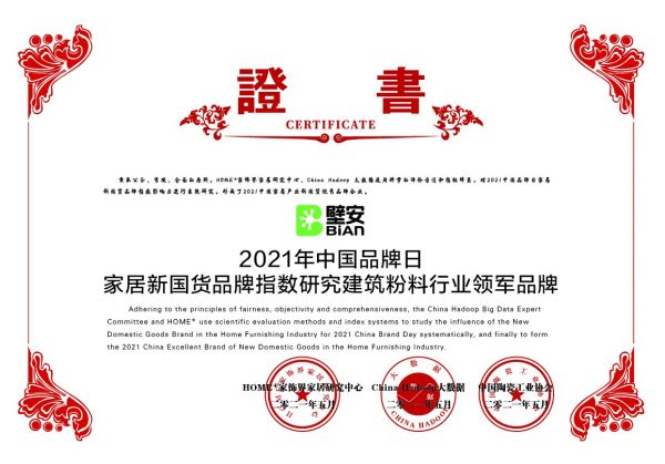 5月10日,由HOME家饰界和China Hadoop大数据联合主办的《2021年中国品牌日家居新国货指数研究报告》在北京发布,壁安以强劲的综合实力再次与东方雨虹、华为、小米、格力、恒洁、亚细亚瓷砖等企业等荣获行业领军品牌称号。这也是壁安继2020年中国品牌日荣获建筑粉料行业领军品牌后,再次蝉联此次荣誉。