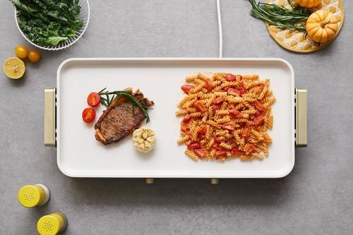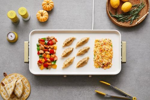 大容量的烤盘设计,几个人围坐在餐桌边却不会感到局促,一边烤鸡翅、虾、牛肉,另一边烤蘑菇、芦笋、小番茄,根据不同的食材来调节温度,每个人喜欢的都安排上,不用久等、也不用为味道battle!