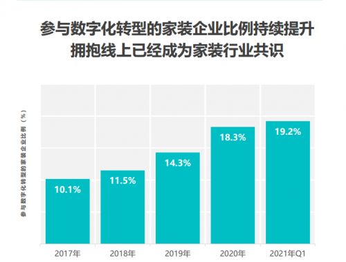 报告显示,为了拥抱年轻人、拥抱线上,越来越多装修公司选择了数字化转型的道路。近年来,参与数字化转型的家装企业比例持续提升,从2017年的10.1%提升至2021年Q1的19.2%;而数字化转型也确实帮助装修公司更加贴近消费者,2020年数字化转型装企线上订单量同比增长15.9%,品牌知名度同比提升20.3%,业务咨询量同比增长28.8%——这些选择了转型的装企,普遍受到了新生代消费者的欢迎。