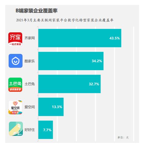 平台赋能的效益吸引了大批装企,报告显示,与互联网家装平台建立合作关系的转型装企比例持续提升,2021年Q1这一比例达到47.1%,而互联网家装平台对装企的吸引则呈现出马太效应的特点,头部家装平台齐家网以43.5%的转型装企覆盖率居行业之首。