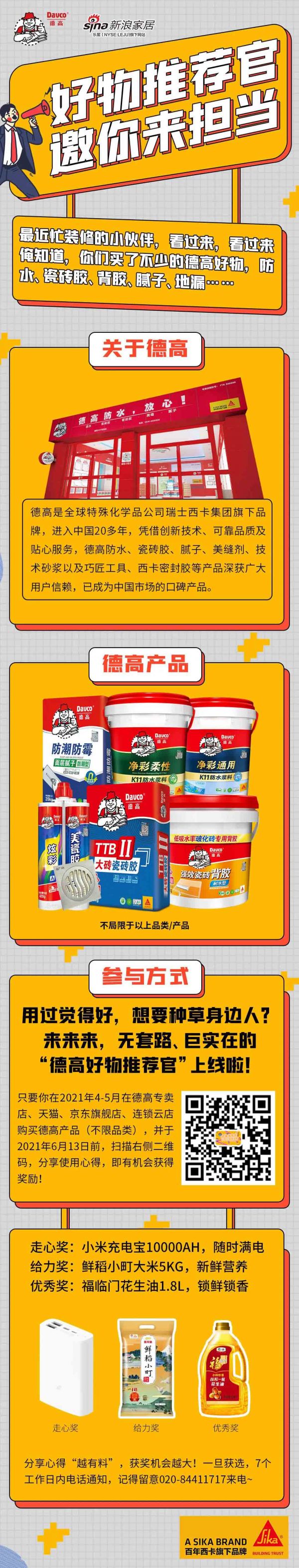 生活舒适度,装修占一半!每一个小细节都要够优秀!德高装修好物,品类齐全,质量出众,近期忙装修的你,一定被他家圈粉了,对不对?即日起,只要你在今年4-5月买过德高产品(不限品类),均可扫描下方海报二维码分享评价,有机会赢得充电宝/米/油等实用礼品!快快扫码吧!