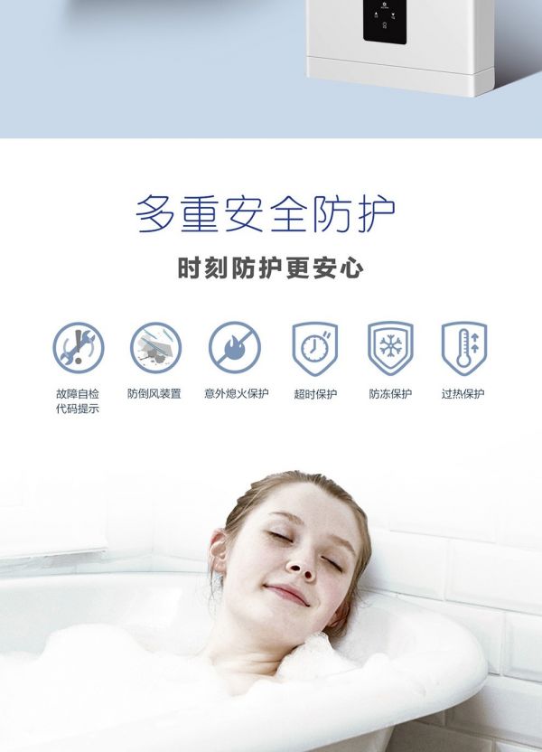 而且,樱花热水器Q901采用了触摸式的显示屏,一键循环,早晚预约循环,全天循环,多种模式,随心选择,时刻给你温暖陪伴。在安全方面,这款热水器表现得也是可圈可点。它有多重的安全防护,故障自检代码提示,防倒风装置,意外熄火保护,超时保护,防冻保护,过热保护,让你用水更加安心。