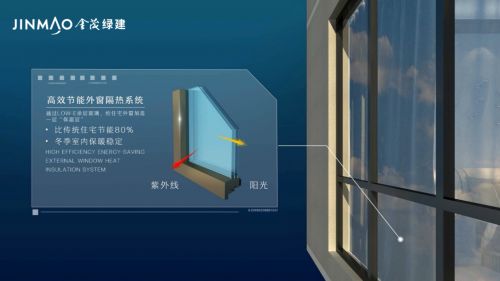 在科技住宅中,金茂绿建采用外窗三层双中空low-E玻璃,防止外界空气渗透,还能有效隔离室外噪声干扰;良好的断热性能,可起到冬天室内暖流不流失,夏天外部热量不流进室内的屏障作用,保持室内温度稳定,能量不易流失。