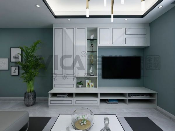 客厅的背景墙以天蓝色为基调,搭配白色的组合式电视柜,整体简洁大方,再增添一盆绿植,低调优雅的感觉由内而外的散发出来。