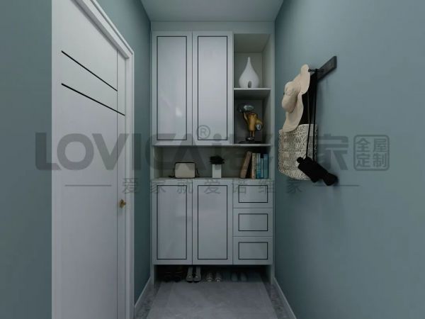 在入户的地方设计了一个到顶式的柜子,封闭式的柜体可以放置一些不常穿或过季的鞋子,开放式的柜体可以放置一些小饰品,整洁的同时又美观舒适。底部镂空的设计减少了换鞋时需要打开柜子的麻烦步骤,既快捷又方便。