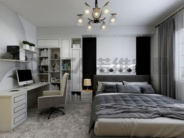 黑白相间的床头柜设计,展现出低调又沉稳的氛围,错落有致的书柜连接着书桌,在安静的氛围中透射出一个忙碌的身影。