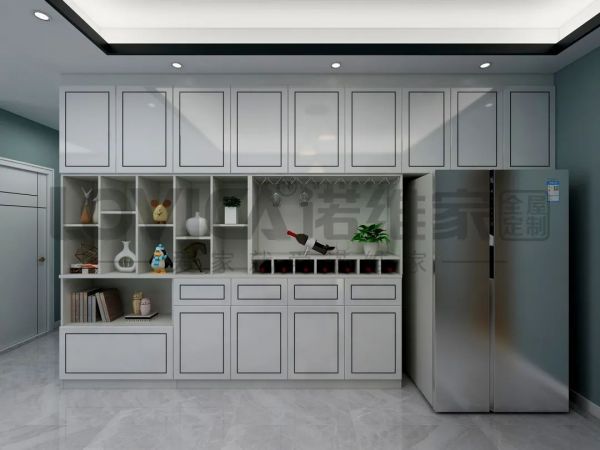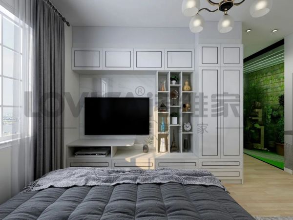 整墙的柜体将空间利用得恰到好处,不仅收纳性满满,而且美观又实用,开放式和封闭式的柜体设计,简洁又大气。