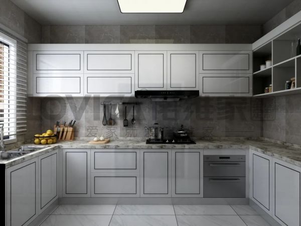 厨房整体以U字形呈现,吊柜+地柜的组合,用流畅的线条凸显出厨房的烟火气息,整体亮眼又舒适。