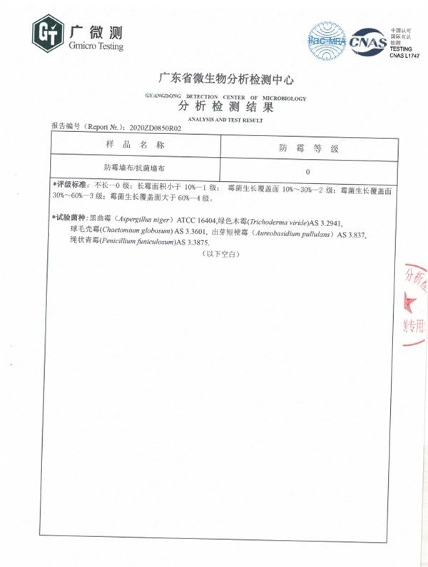 汇明A+墙布拥有行业内最高级别——五级防水标准,保证水分不与糯米胶接触,起到防霉作用;对墙布进行防霉抗菌处理,使墙布防霉达到一级指标,抗菌抑菌率达99.9%,再次降低墙布发霉现象。