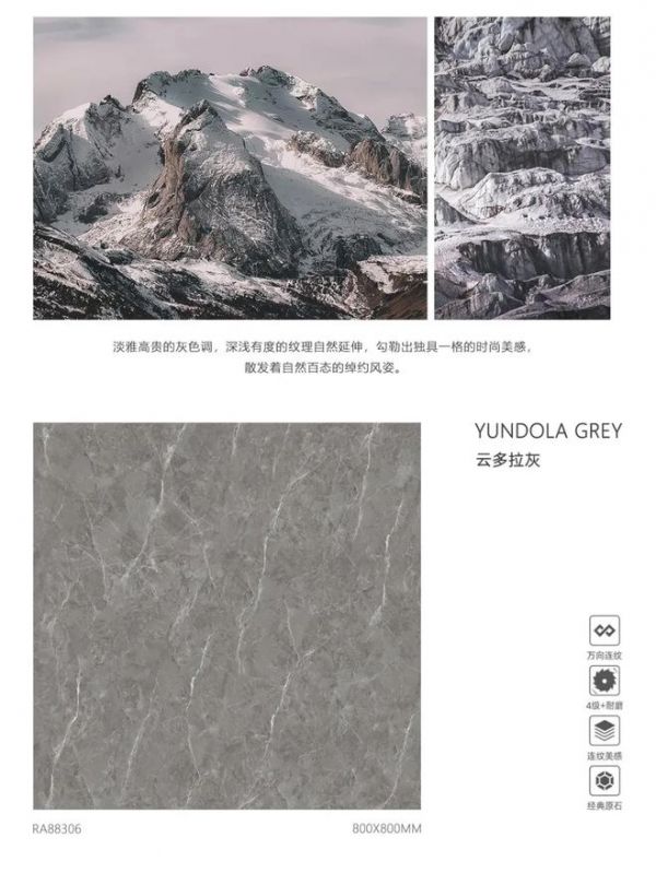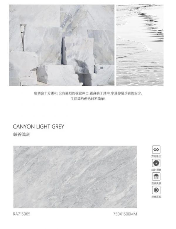 大罗马瓷砖新推出自由连纹系列呈现自然、连贯的石材纹理突破单片瓷砖的尺寸界限使有限的空间在视觉上得到无限的延伸不仅实现了一片瓷砖一个空间的装饰效果还提升了空间的美感与艺术气质。