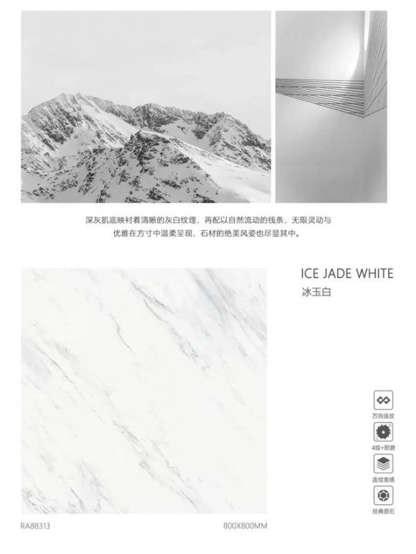 纯白的砖面中渗入飘逸浅灰的纹理,质感细腻,天然无瑕,如丝如画,高冷的色泽与肌理,打造出前卫的艺术空间,在繁忙过后享受宁静生活。