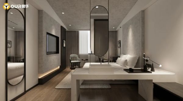 展厅内奥华囊括阳台、吊顶、墙品等主题展示区。顶墙整装模式在多种工艺、多种配套下的产品应用下,直观展示出奥华整合供应链的强大,为家居空间和商业空间的应用提供更多可能。