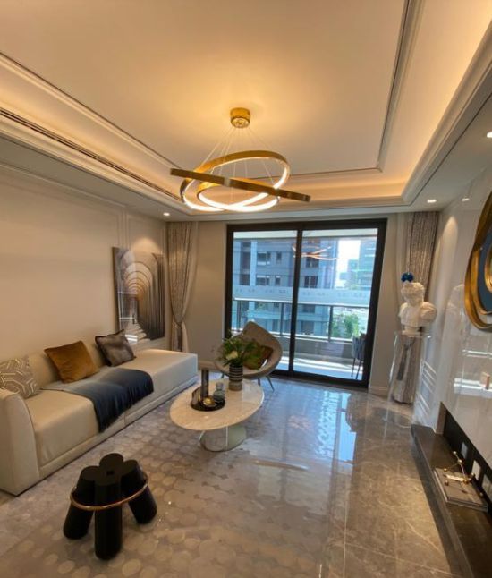 房子选择的是现代轻奢装修风格,样板房有个缺点,那就是尽量展现装修的美,对于收纳功能很少规划到,这也是很多人说样板间不实用的原因。客厅布置了一张很有特色的皮艺沙发,右边没有扶手,不过坐垫很宽厚,看着有个性,坐起来也舒服。电视背景墙用瓷砖作为装饰,搭配置物架电视柜,显得瓷砖非常的上档次。