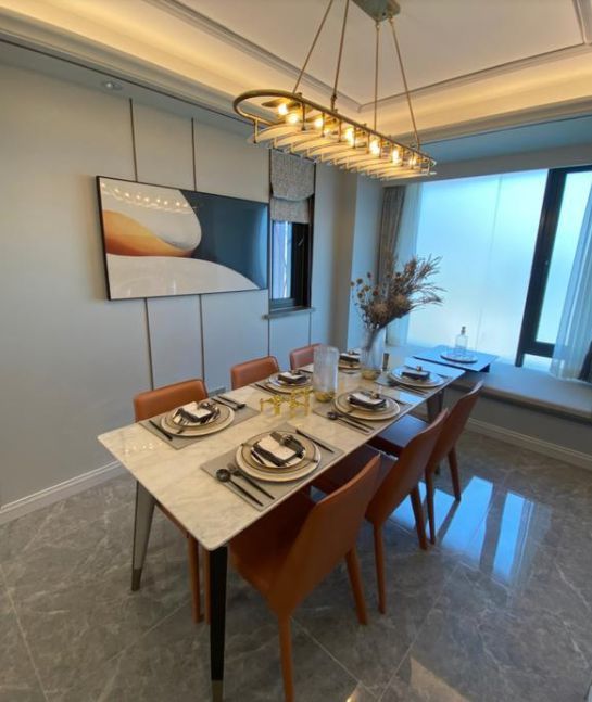 餐厅给人的印象就是简洁个性,天花板上装了一排吊灯,显得非常的有特色,吊顶装了暖光灯带,搭配石膏条,显得更有层次感。墙面加了镀金条装饰,显得更大气上档次,还挂了画作为装饰,能填补墙面的空白。餐厅带有一个飘窗,铺上软垫上就可以用来坐着休息看风景了。