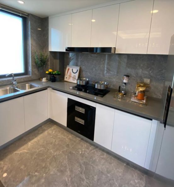 厨房打造了一个L型的橱柜,在窗户边装了个双水槽,消毒柜嵌入式设计,灰色的橱柜台面显得高级又耐脏,还利用墙面装了吊柜,能增加不少的收纳空间。