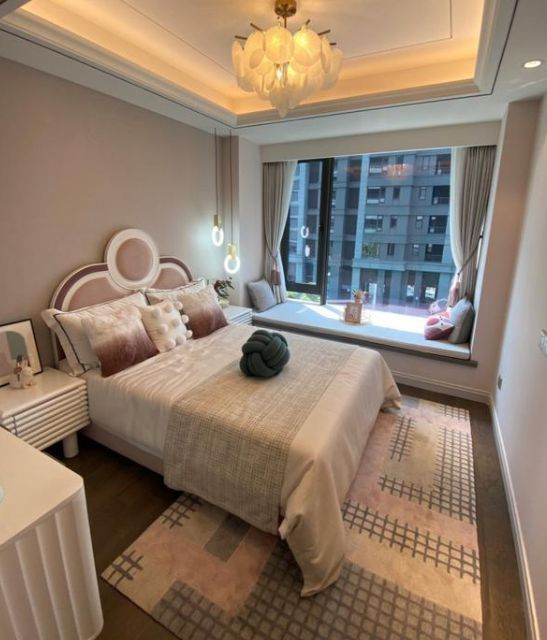 公主房是最满意的一个设计了,摆放了一张舒适奢华的大床,却不失可爱,搭配粉色的装饰,显得整个房间都很公主风。公主房带有一个飘窗,布置了抱枕,装了一整面落地窗,采光效果好,看风景的视野也是极棒的。
