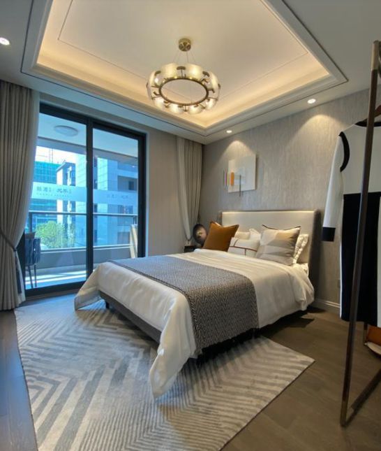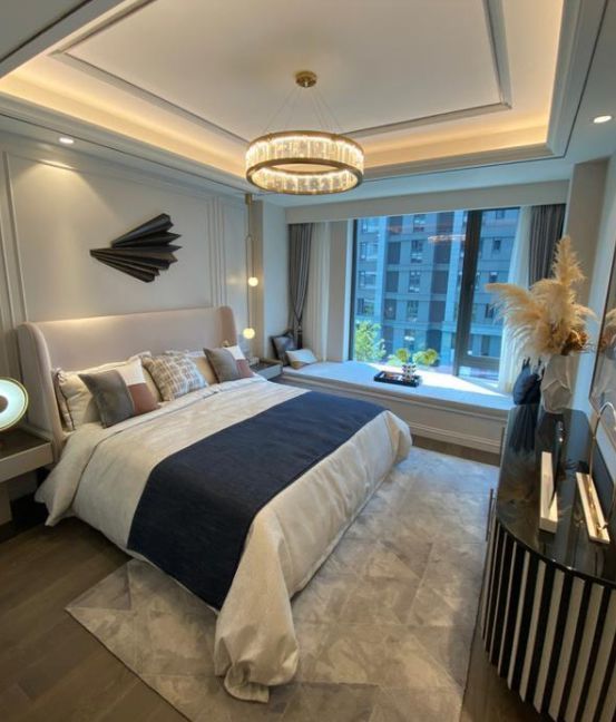 主卧室也带有飘窗,同样布置了抱枕还有大大的落地窗,采光视野都很好。床头背景墙用石膏线走线,简洁大气,中间还装了装饰品,选择了一盏圆形吊灯,暖光灯的布置下显得温馨无比,地面铺了地毯,显得空间更有层次感,床尾布置了一个柜子,可以用来收纳布置装饰品。
