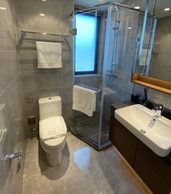 浴室利用墙角装了玻璃沐浴房,能起到干湿分离的作用,左边的空间装了马桶,右边则装了浴室柜。