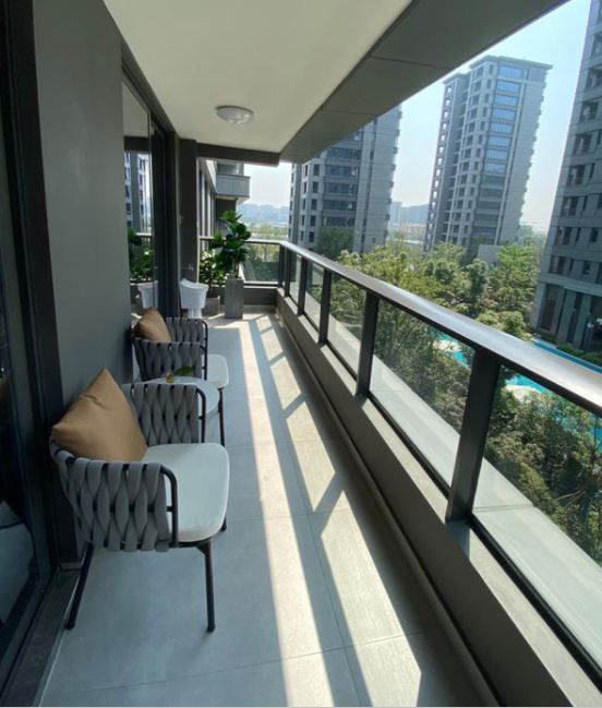阳台上摆放了桌子还有椅子,有空的时候就可以坐上面看风景吹吹风,阳台没有封装起来,视野显得更开阔。