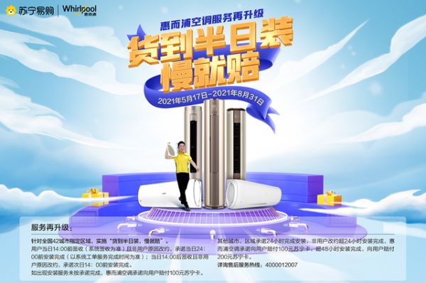 此次,惠而浦在空调旺季来临之前再一次升级货到半日装服务,几乎实现了“即买即送即装”。即使天公不作美、一夜入夏,惠而浦也能助用户“半日享清凉”。具体来说,全国42个城市指定区域的用户在当日14点前签收空调,即可享当日24点前安装完成的迅捷服务;如未按承诺完成,惠而浦承诺向用户赔付100元苏宁卡。而其他城市区域的用户也将获得“30分钟响应、货到24小时内安装”的送装服务。