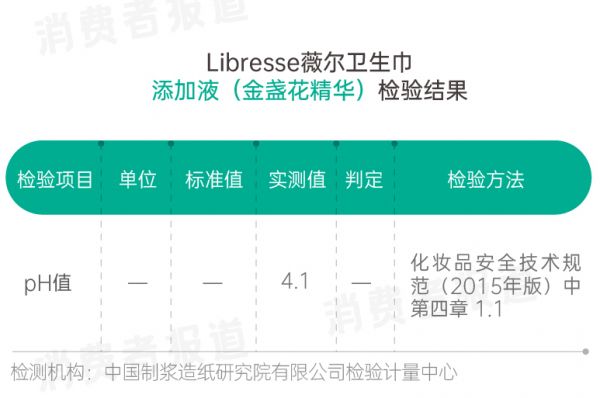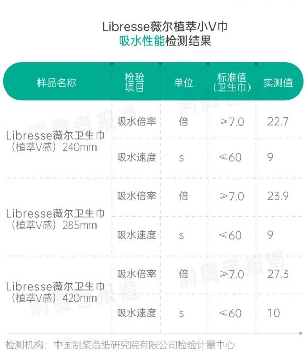 检测结果显示,Libresse薇尔植萃小V巾吸水性能表现优异,实测吸水倍率是标准值的三到四倍;吸水速度为9秒或10秒,远低于标准值要求。