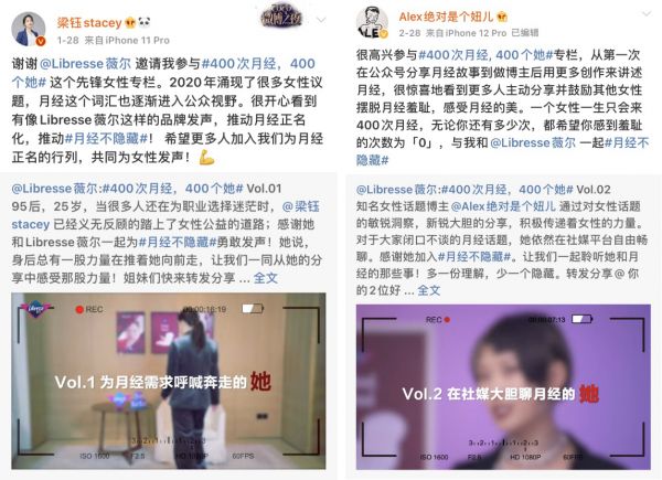 另外,LIbresse薇尔于今年年初启动的#400次月经,400个她#专栏通过分享不同女性的人生经历,让更多的人能感受女性真实的力量,不仅仅传递了#月经不隐藏#的主张,更是鼓励了更多女性自信不隐藏。
