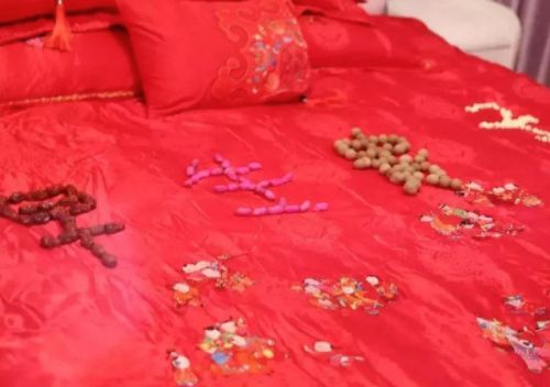 2、铺床一般会请专人来铺,床上会撒有花生、桂圆、红枣、莲子等干果,寓意着早生贵子。现在有的婚床上还会摆放一些鲜花作为装饰,以及新人的婚纱照来供给来宾欣赏观看。