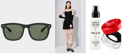 (左:雷朋方形复古太阳镜 中:太平鸟链条吊带紧身连衣裙 右:玫珂菲限量版蜜粉礼盒)