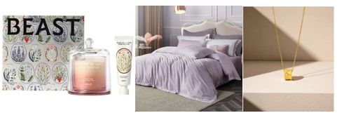 (左:野兽派千叶玫瑰心意礼盒 中:罗莱家纺贡缎全棉四件套 右:周大福玄彬转运珠)